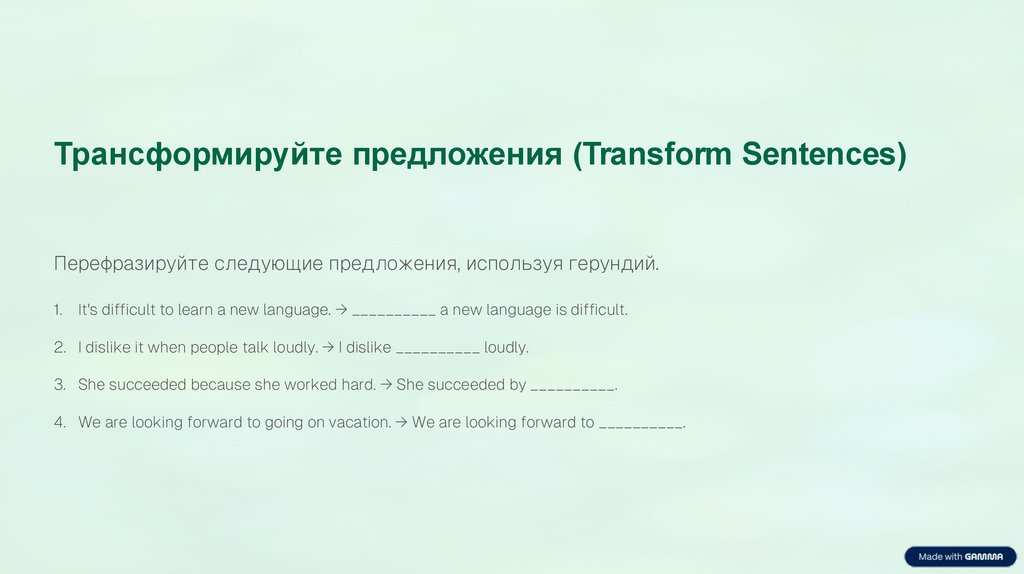Трансформируйте предложения (Transform Sentences)Перефразируйте следующие предложения, используя герундий.