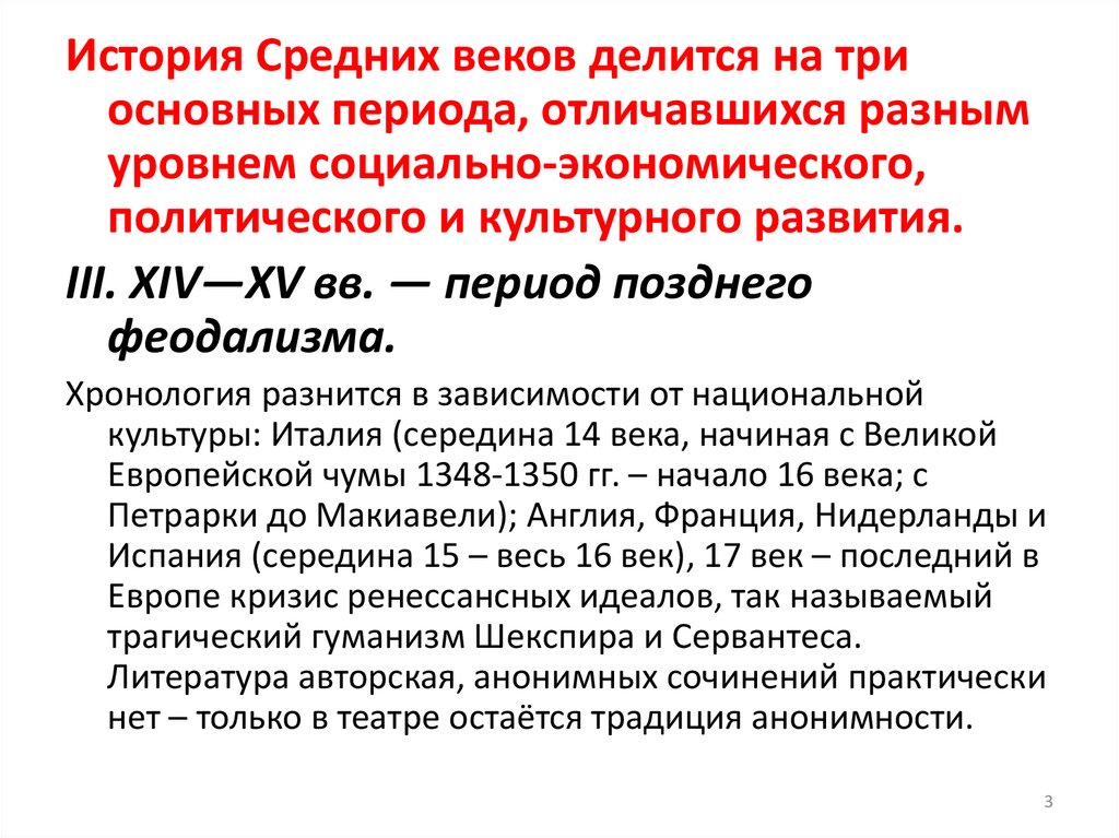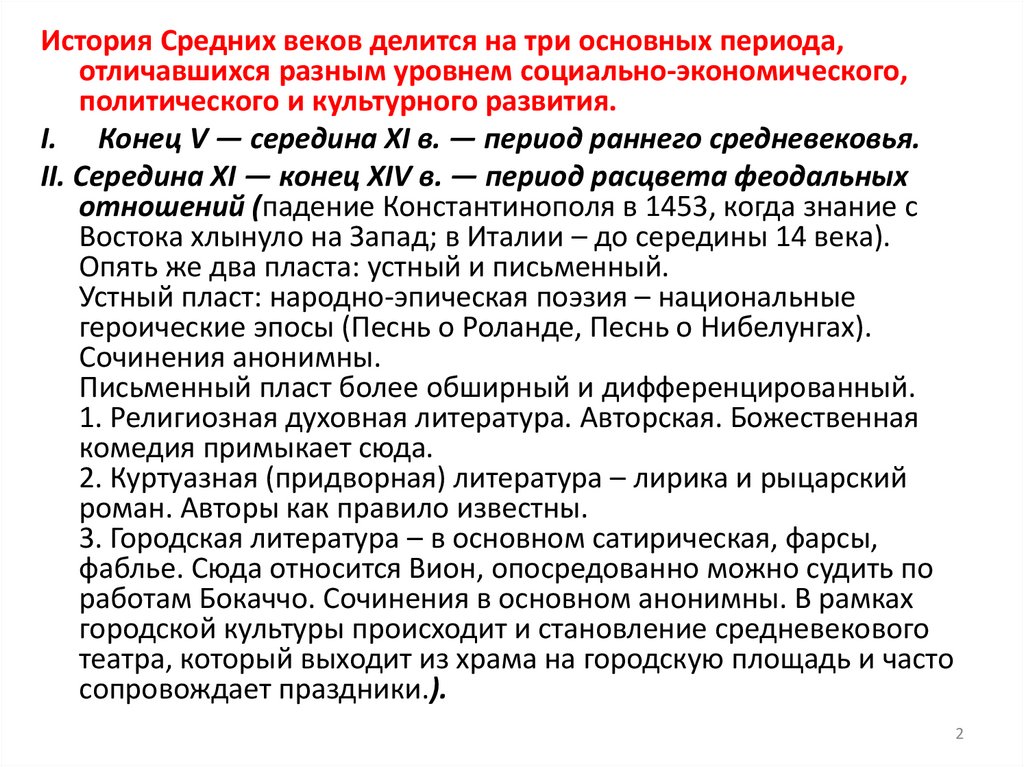 История Средних веков делится на триосновных периода, отличавшихся разным