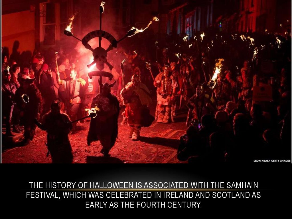 THE HISTORY OF HALLOWEEN IS ASSOCIATED WITH THE SAMHAINFESTIVAL, WHICH WAS CELEBRATED IN IRELAND AND SCOTLAND AS