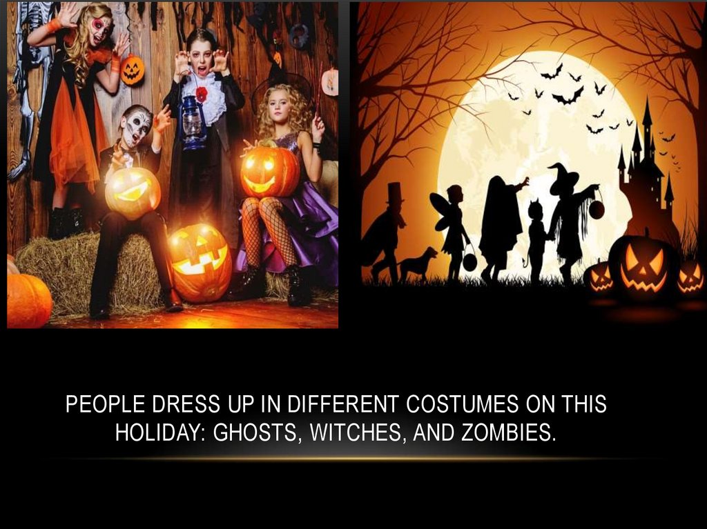 PEOPLE DRESS UP IN DIFFERENT COSTUMES ON THISHOLIDAY: GHOSTS, WITCHES, AND ZOMBIES.