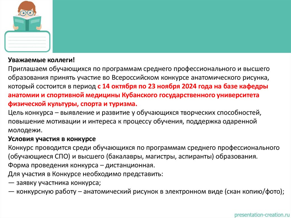 образования принять участие во Всероссийском конкурсе анатомического рисунка,