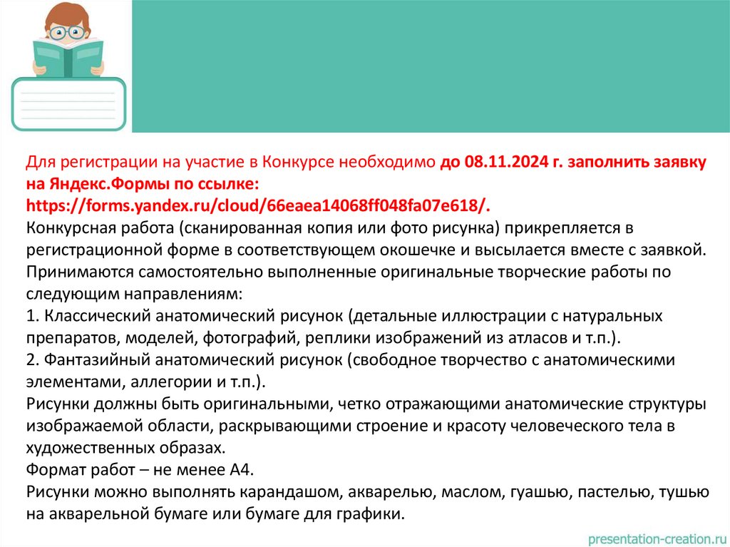 Для регистрации на участие в Конкурсе необходимо до 08.11.2024 г. заполнить заявкуна Яндекс.Формы по ссылке: