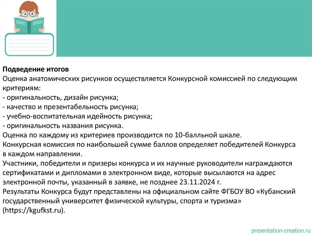 Подведение итоговОценка анатомических рисунков осуществляется Конкурсной комиссией по следующим