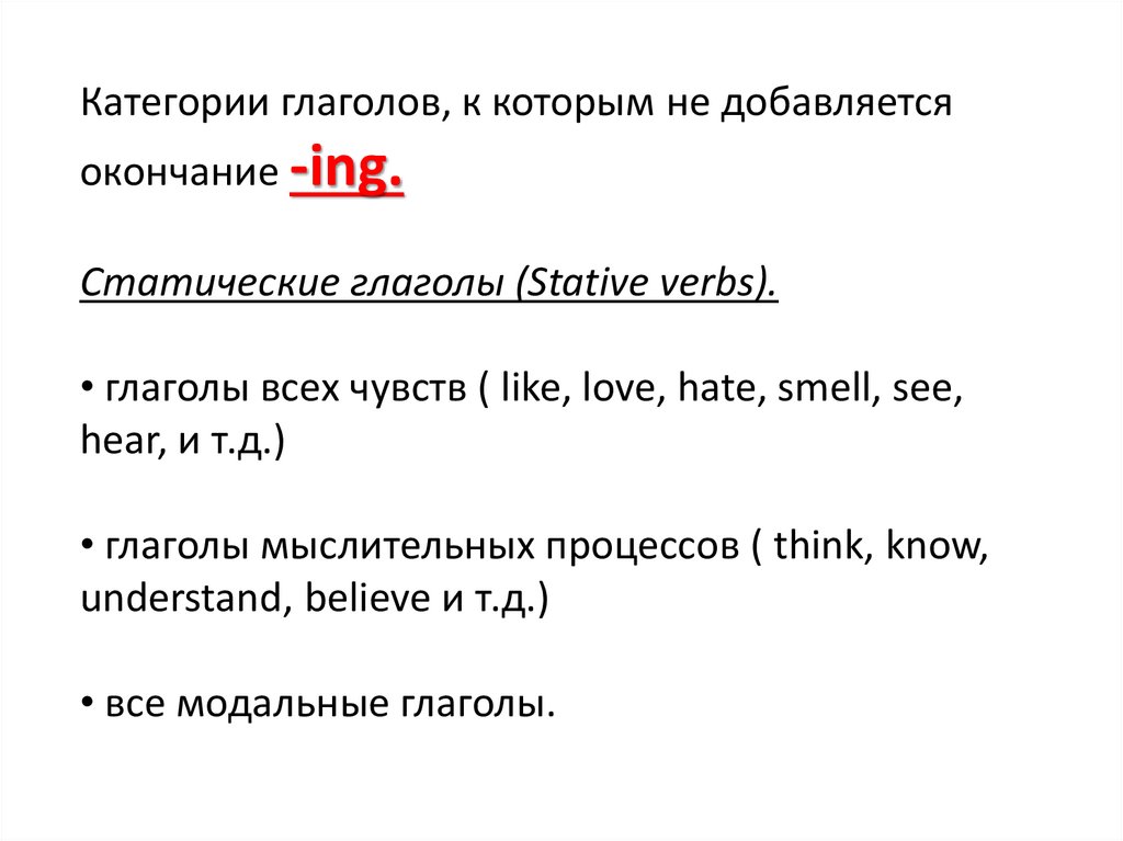 Категории глаголов, к которым не добавляетсяокончание -ing.