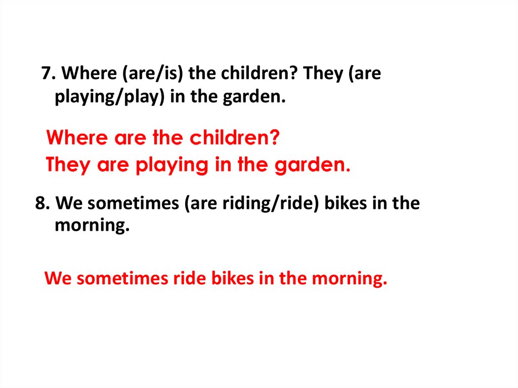 7. Where (are/is) the children? They (areplaying/play) in the garden.