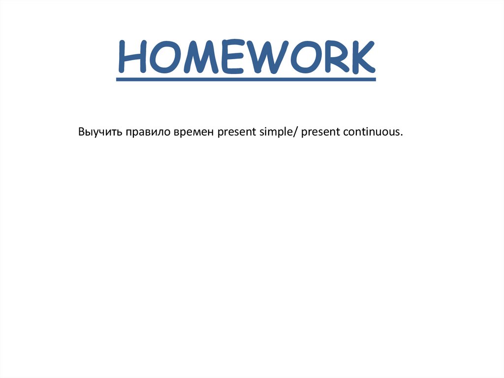 HOMEWORKВыучить правило времен present simple/ present continuous.