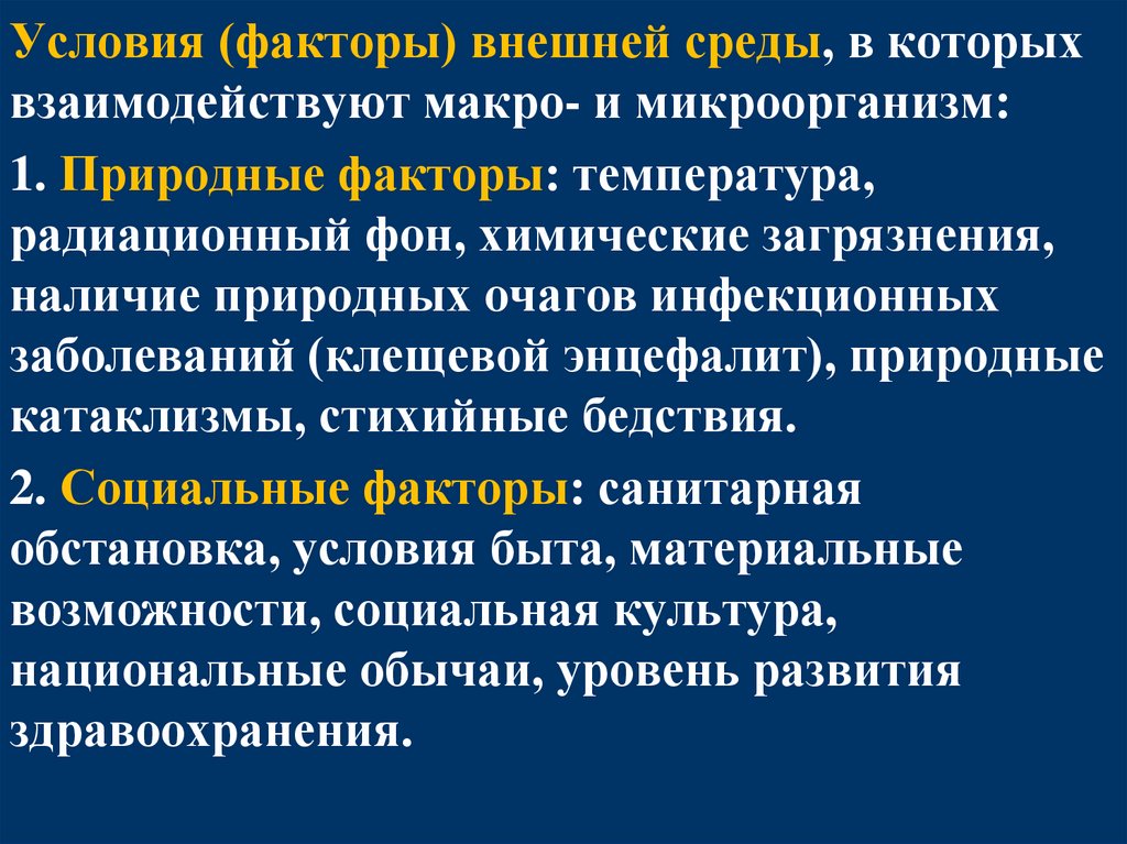 Условия (факторы) внешней среды, в которыхвзаимодействуют макро- и микроорганизм: