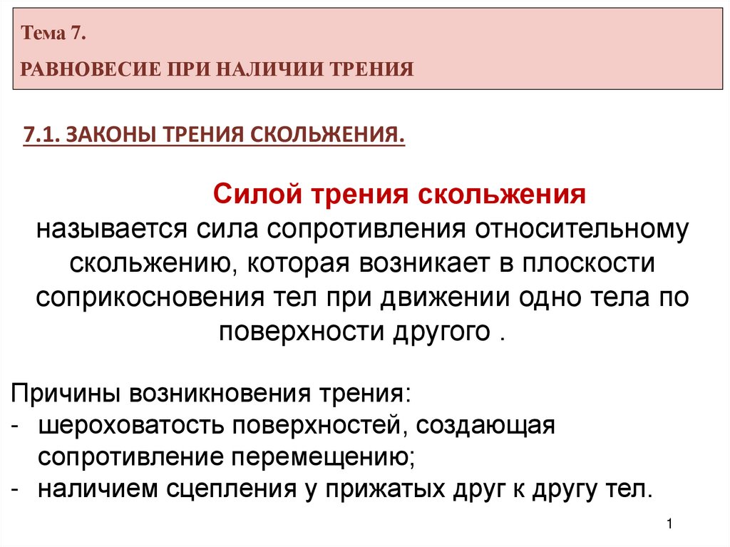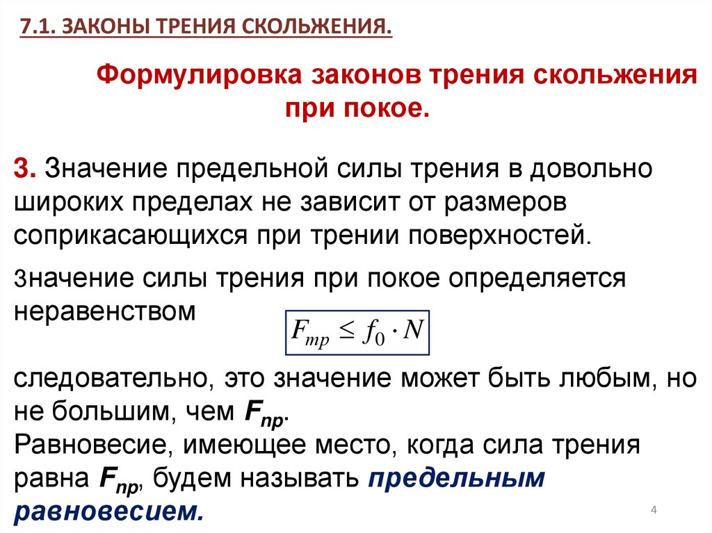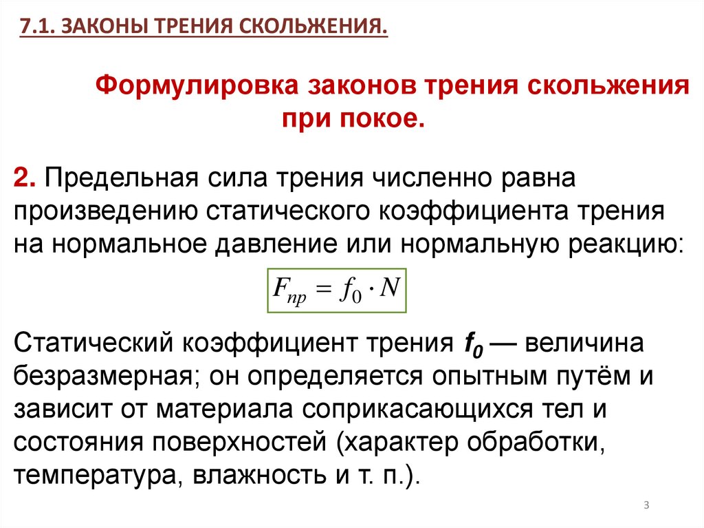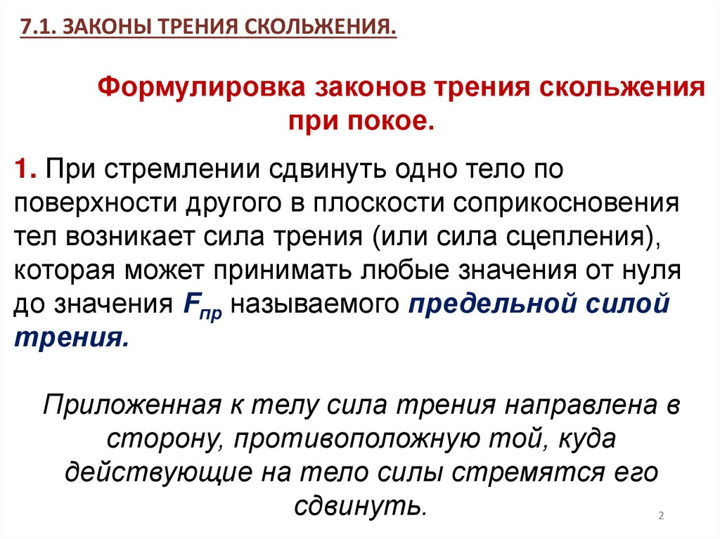 7.1. ЗАКОНЫ ТРЕНИЯ СКОЛЬЖЕНИЯ.Формулировка законов трения скольжения
