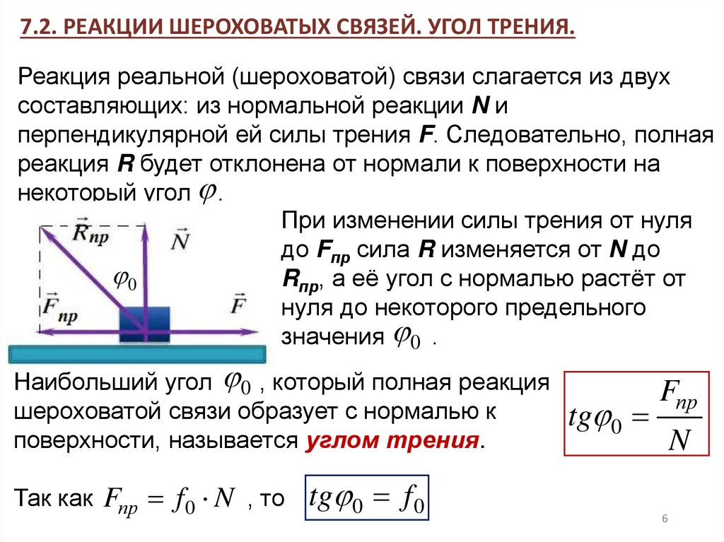 7.2. РЕАКЦИИ ШЕРОХОВАТЫХ СВЯЗЕЙ. УГОЛ ТРЕНИЯ.Реакция реальной (шероховатой) связи слагается из двух