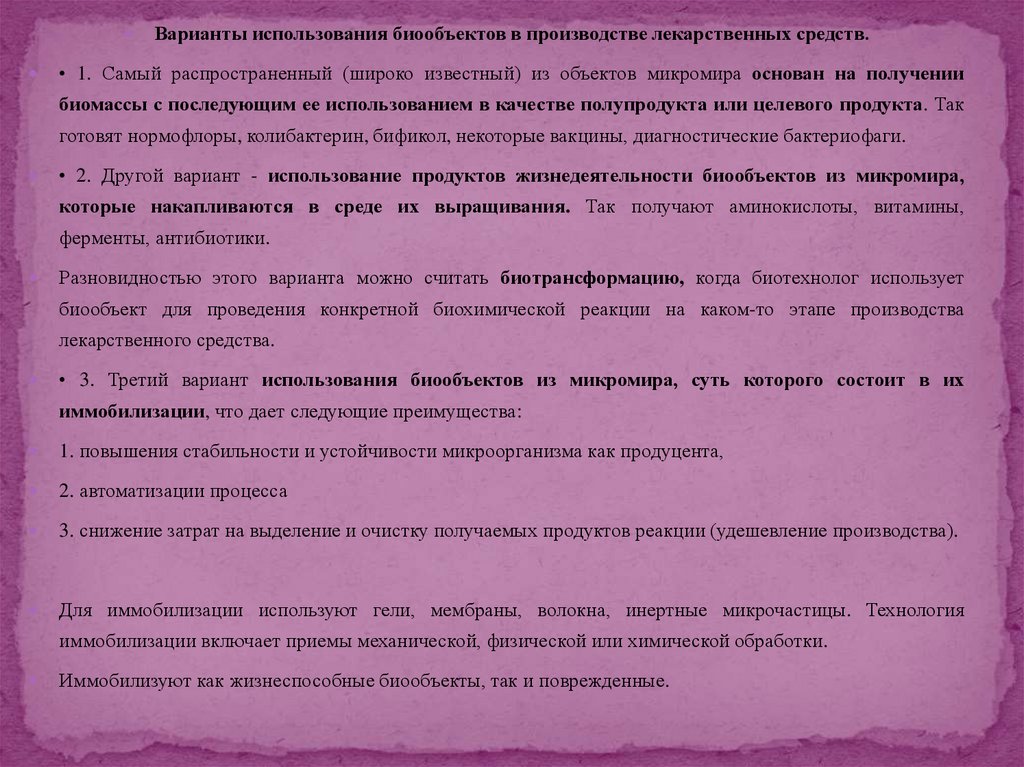 Варианты использования биообъектов в производстве лекарственных средств.• 1. Самый распространенный (широко известный) из объектов микромира основан на получении