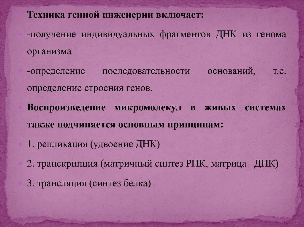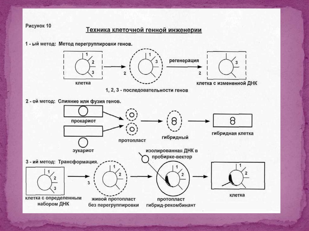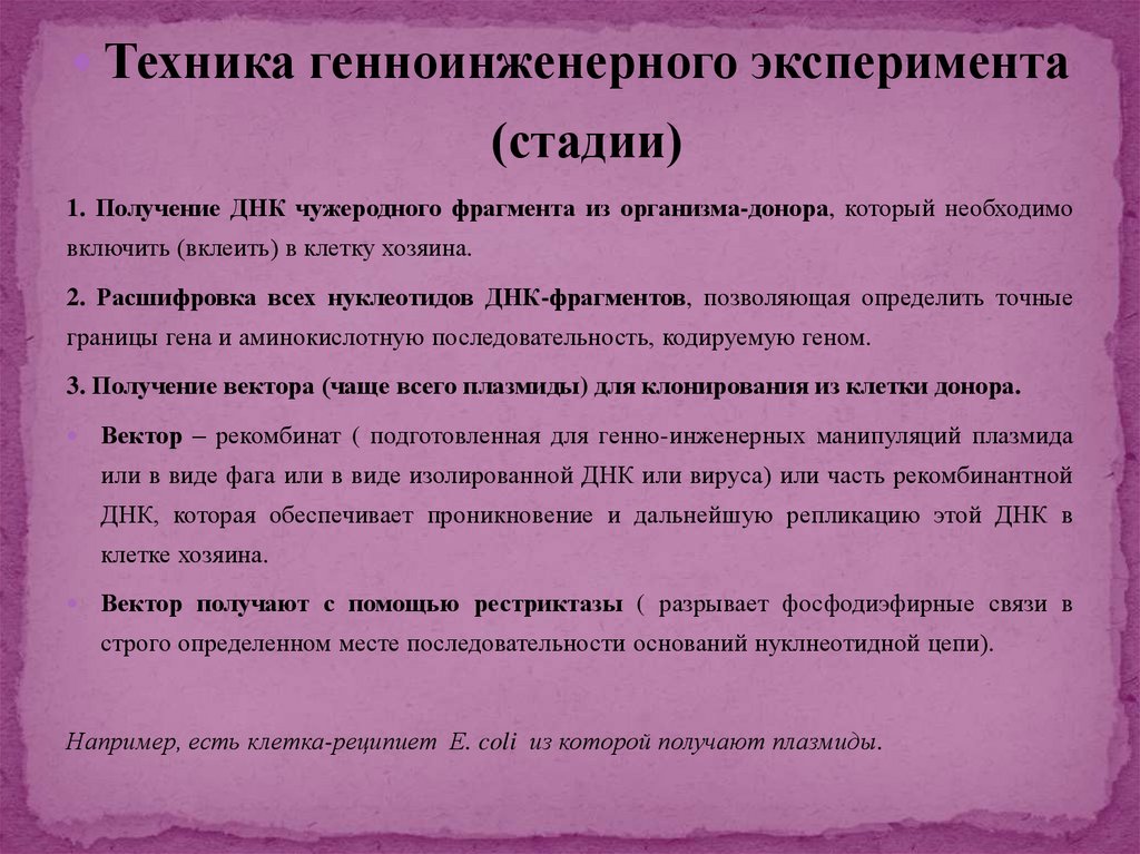 Техника генной инженерии включает:-получение индивидуальных фрагментов ДНК из генома