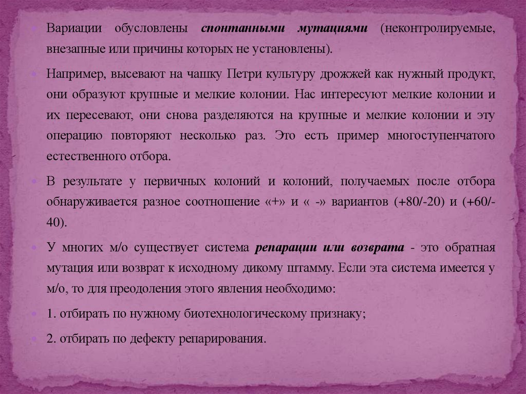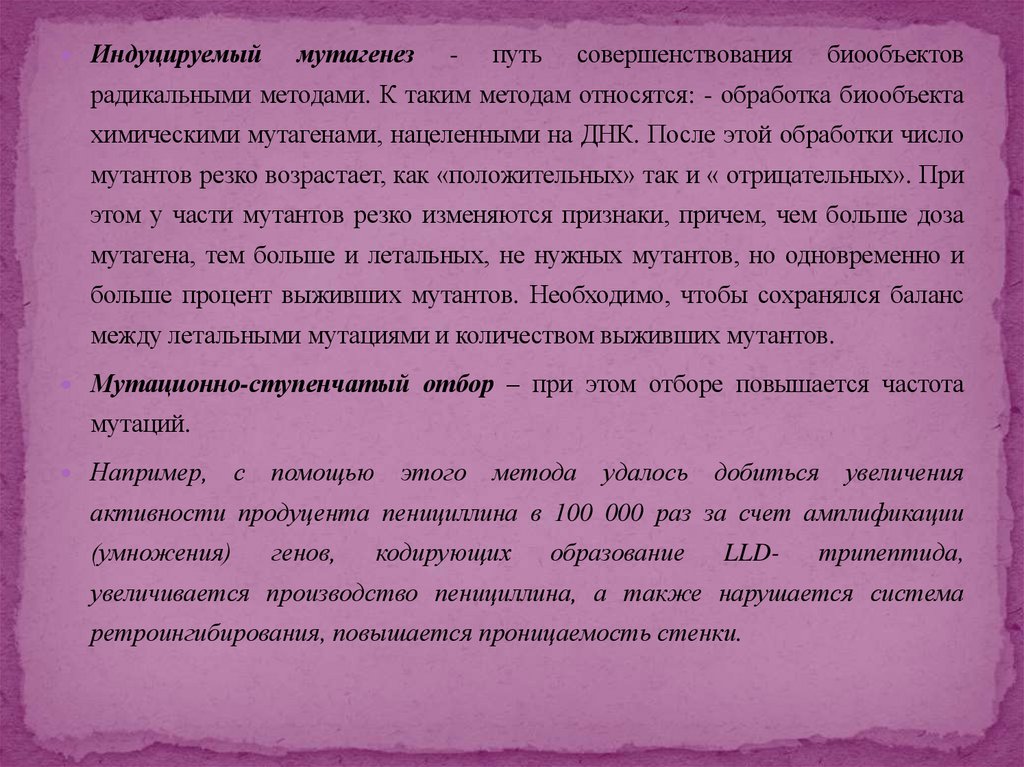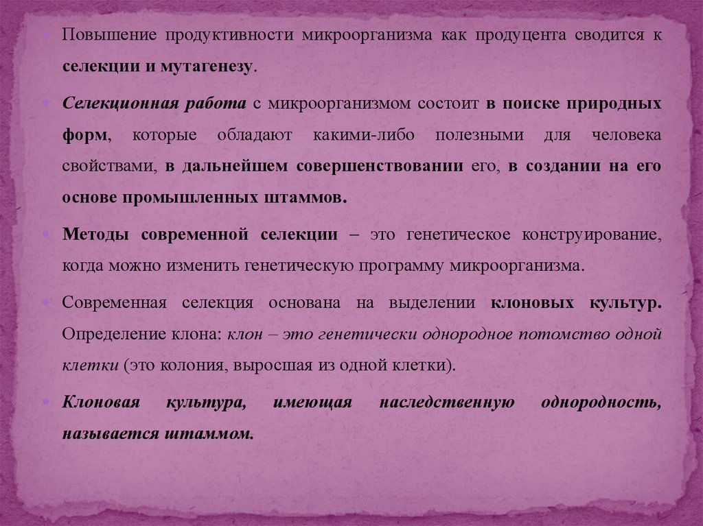 Повышение продуктивности микроорганизма как продуцента сводится кселекции и мутагенезу.