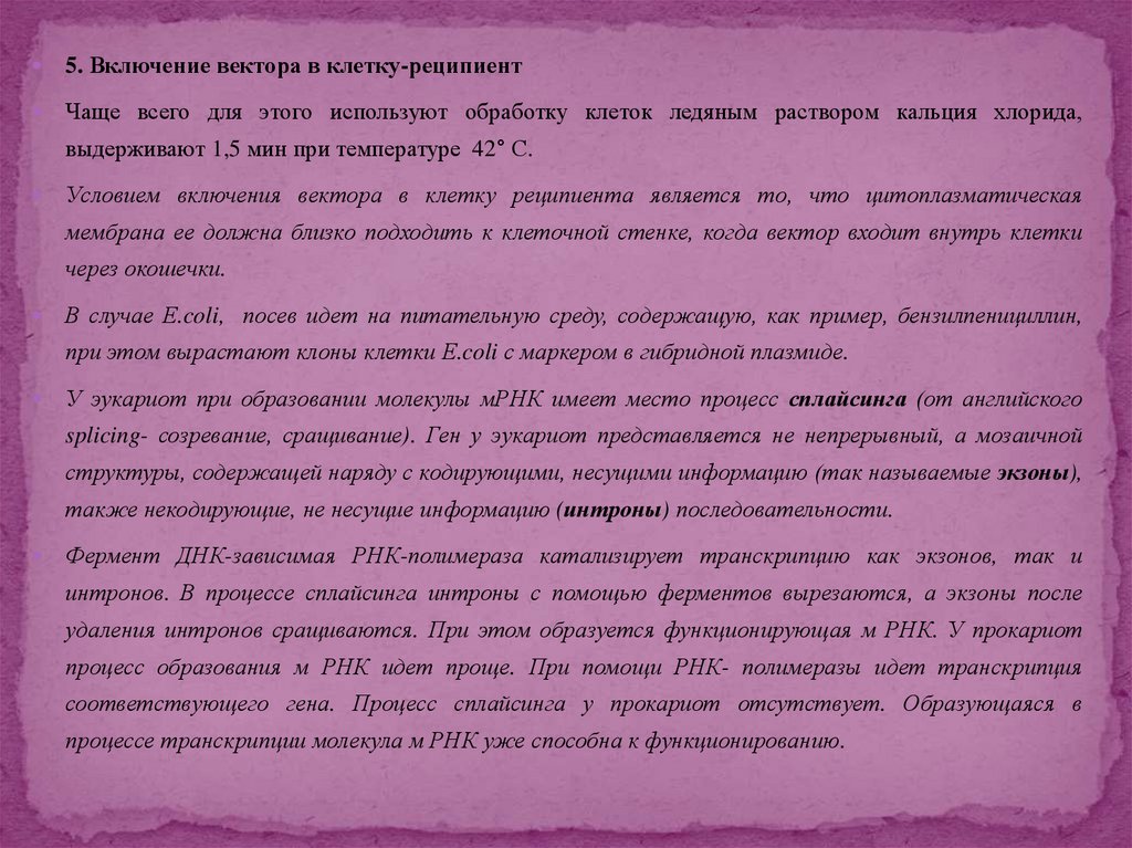 5. Включение вектора в клетку-реципиентЧаще всего для этого используют обработку клеток ледяным раствором кальция хлорида,