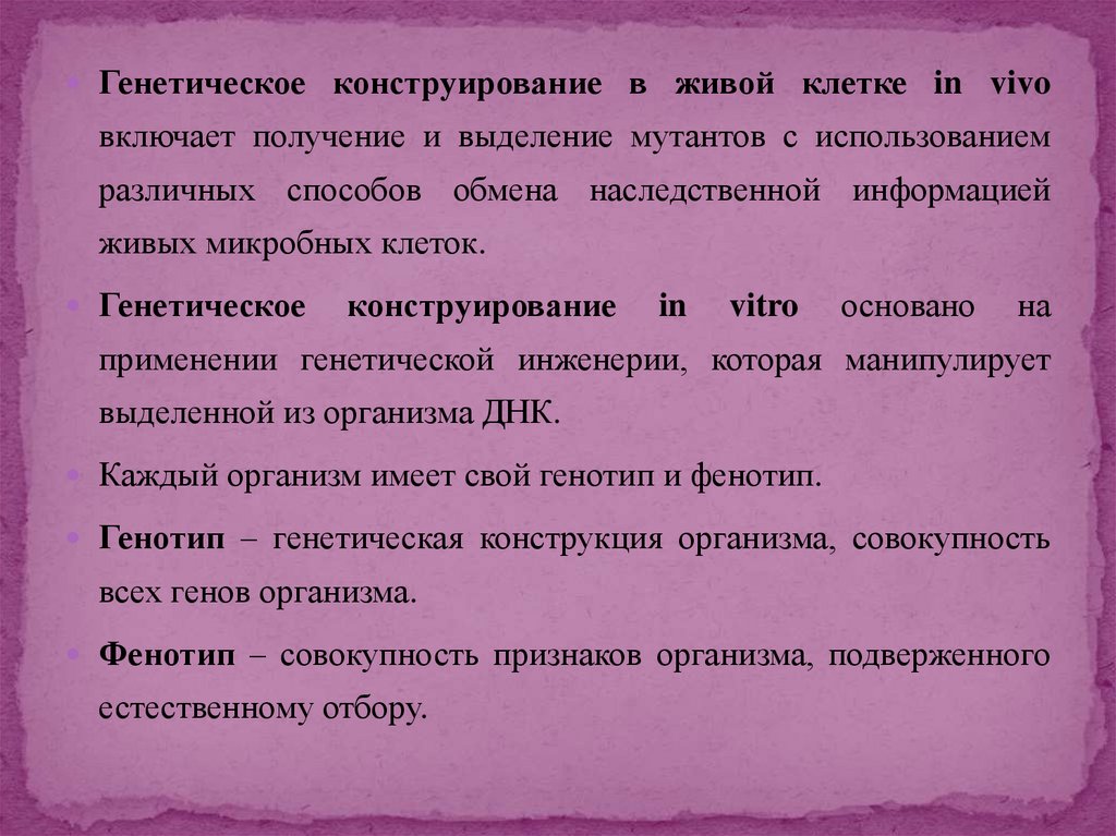 Генетическое конструирование в живой клетке in vivoвключает получение и выделение мутантов с использованием