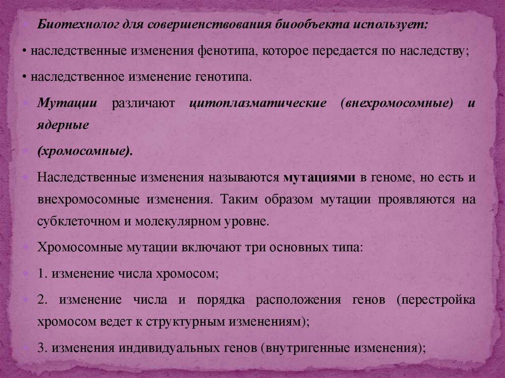 Биотехнолог для совершенствования биообъекта использует:• наследственные изменения фенотипа, которое передается по наследству;