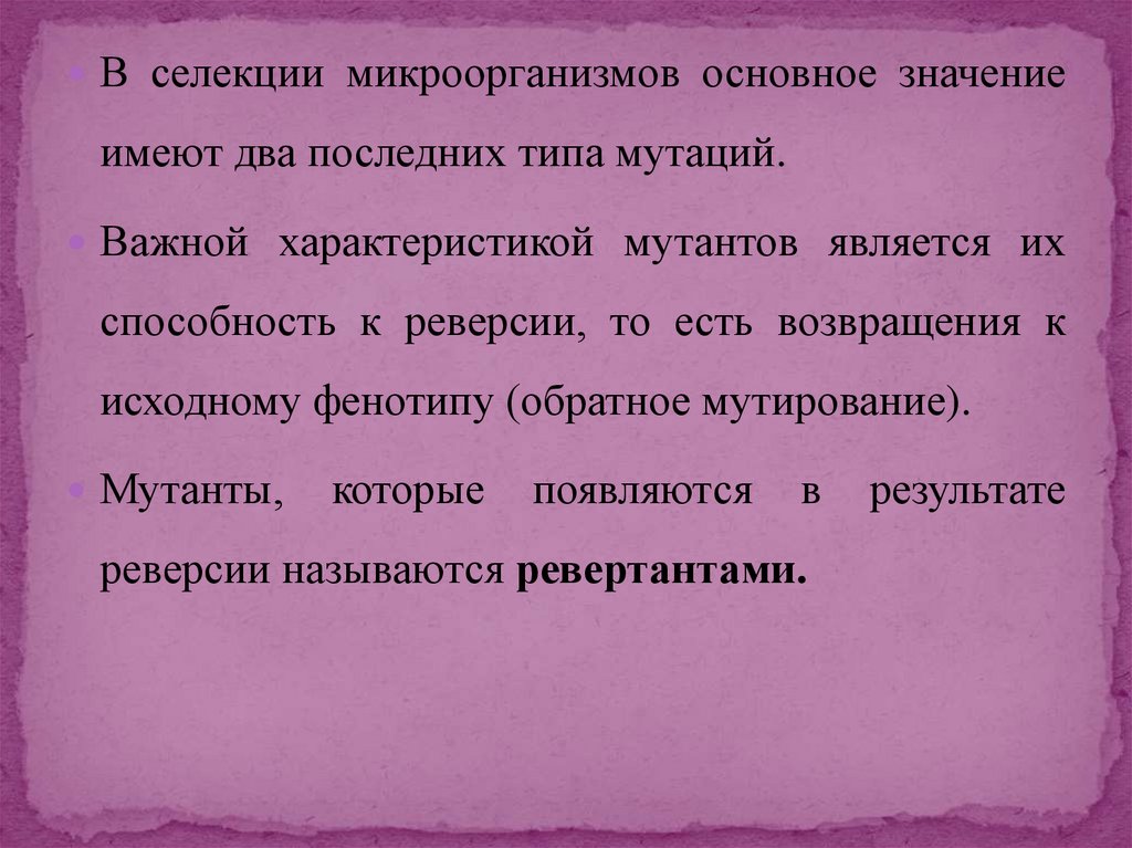 В селекции микроорганизмов основное значениеимеют два последних типа мутаций.