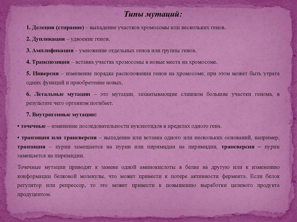Типы мутаций:1. Делеция (стирание) – выпадение участков хромосомы или нескольких генов.