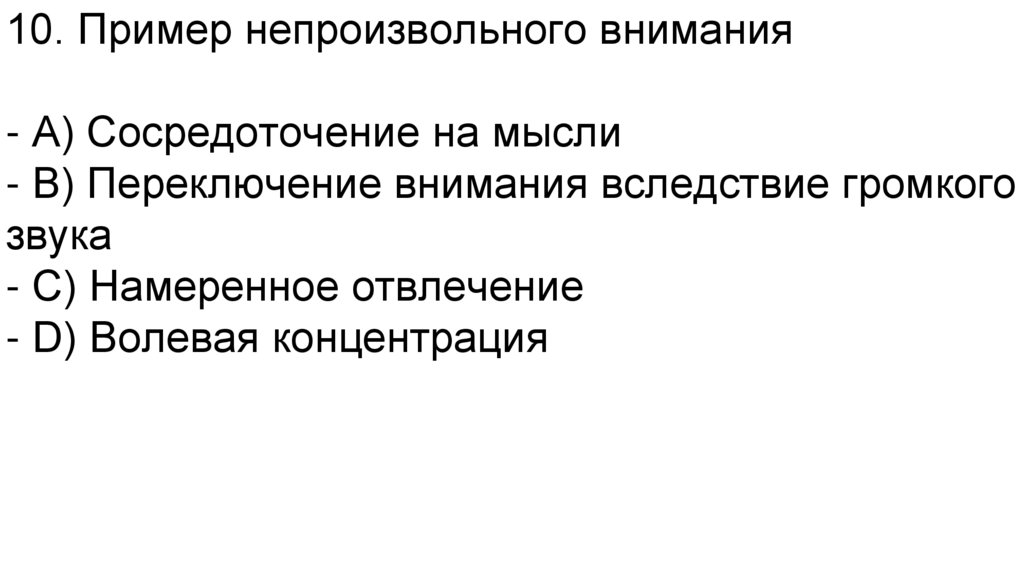 10. Пример непроизвольного внимания- A) Сосредоточение на мысли