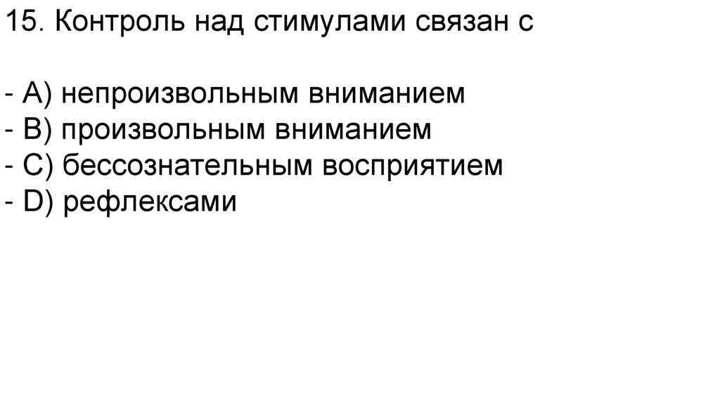 15. Контроль над стимулами связан с- A) непроизвольным вниманием
