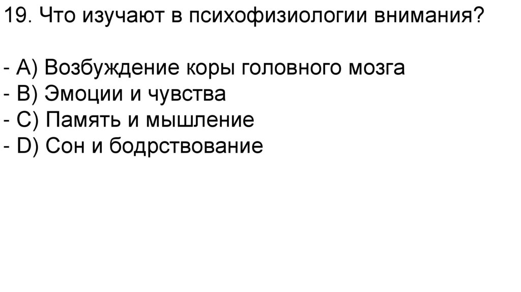 19. Что изучают в психофизиологии внимания?- A) Возбуждение коры головного мозга