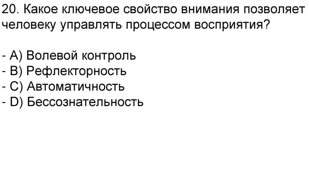 20. Какое ключевое свойство внимания позволяетчеловеку управлять процессом восприятия?