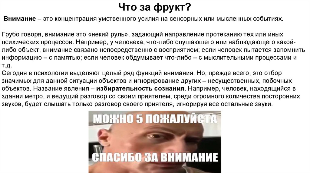 Что за фрукт?Внимание – это концентрация умственного усилия на сенсорных или мысленных событиях.