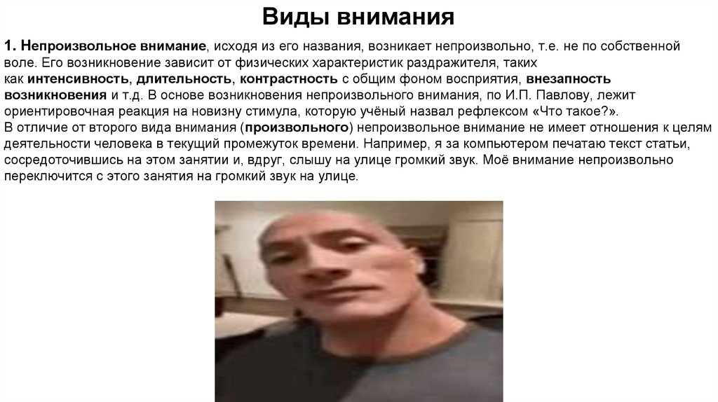 Виды внимания1. Непроизвольное внимание, исходя из его названия, возникает непроизвольно, т.е. не по собственной