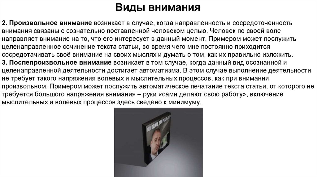 Виды внимания2. Произвольное внимание возникает в случае, когда направленность и сосредоточенность