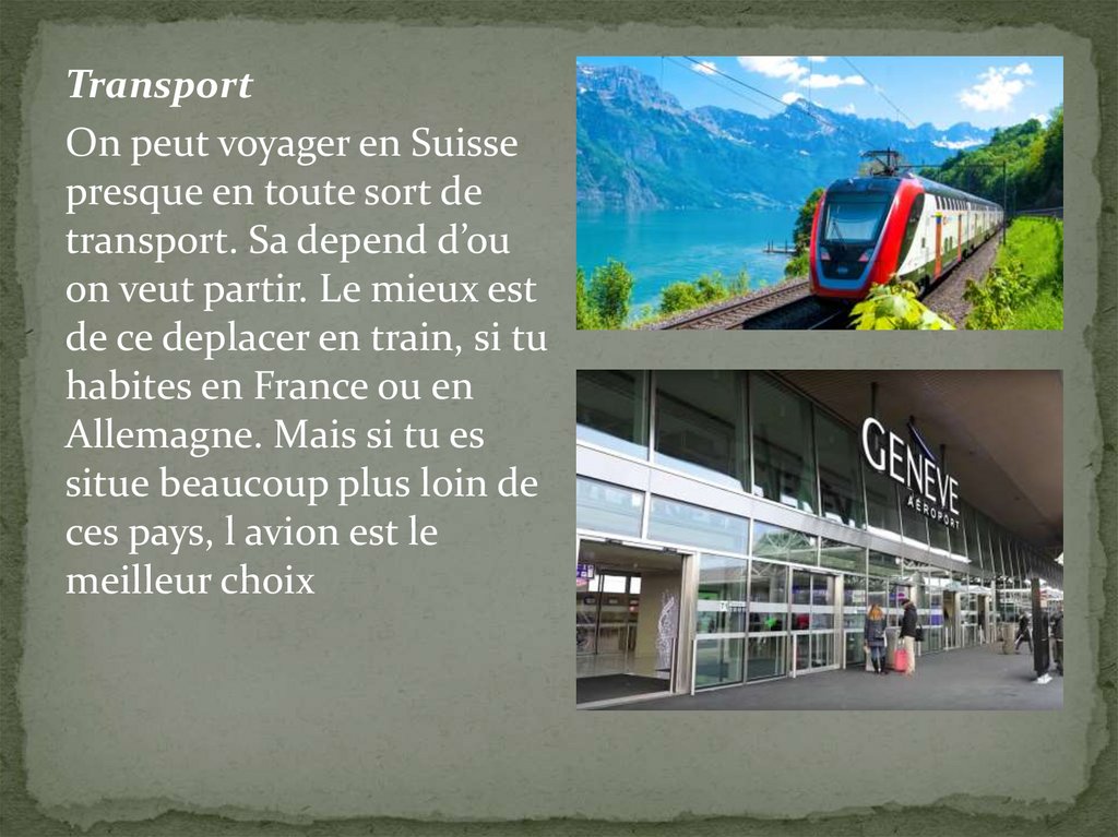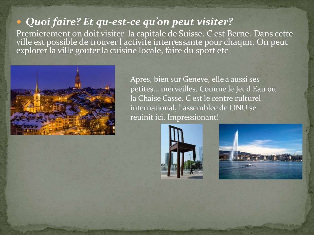Premierement on doit visiter la capitale de Suisse. C est Berne. Dans cette