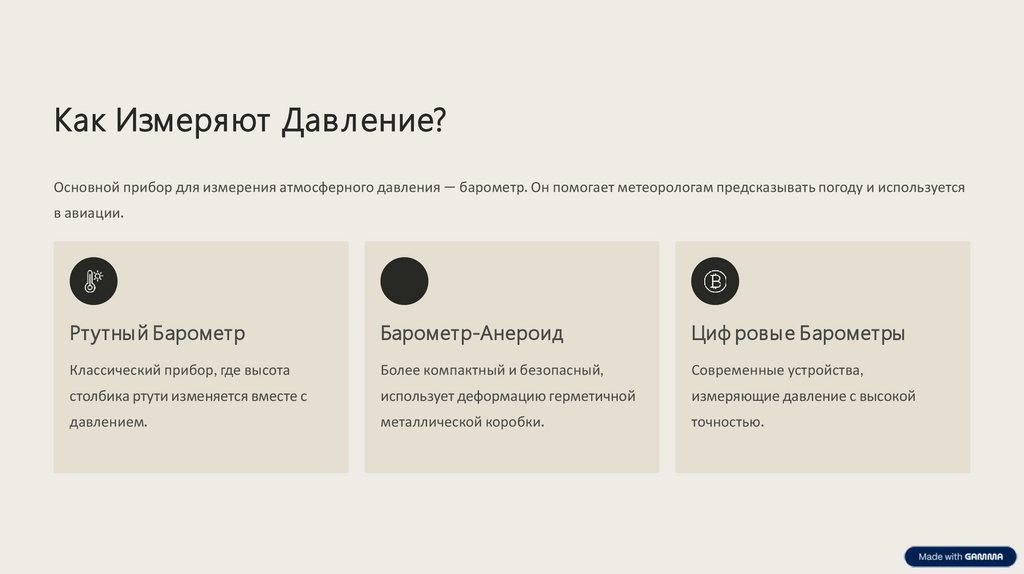 Как Измеряют Давление?Основной прибор для измерения атмосферного давления — барометр. Он помогает метеорологам предсказывать погоду и используется
