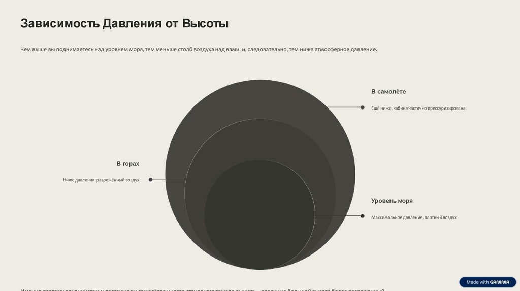 Зависимость Давления от ВысотыЧем выше вы поднимаетесь над уровнем моря, тем меньше столб воздуха над вами, и, следовательно, тем ниже атмосферное давление.