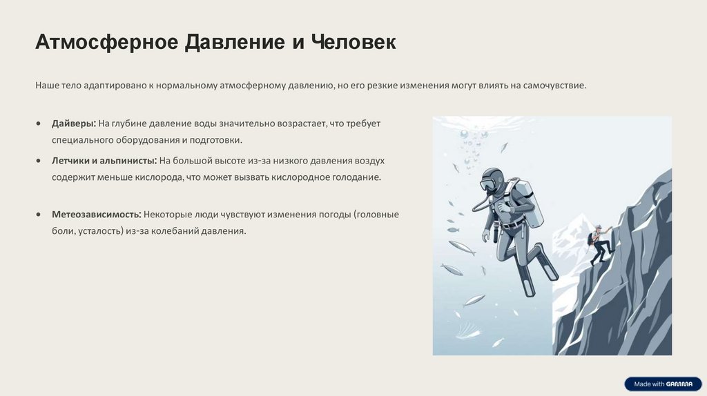Атмосферное Давление и ЧеловекНаше тело адаптировано к нормальному атмосферному давлению, но его резкие изменения могут влиять на самочувствие.