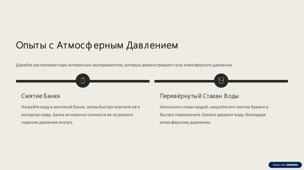 Опыты с Атмосф ерным ДавлениемДавайте рассмотрим пару интересных экспериментов, которые демонстрируют силу атмосферного давления.