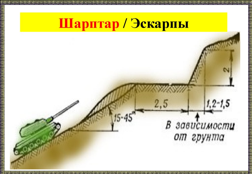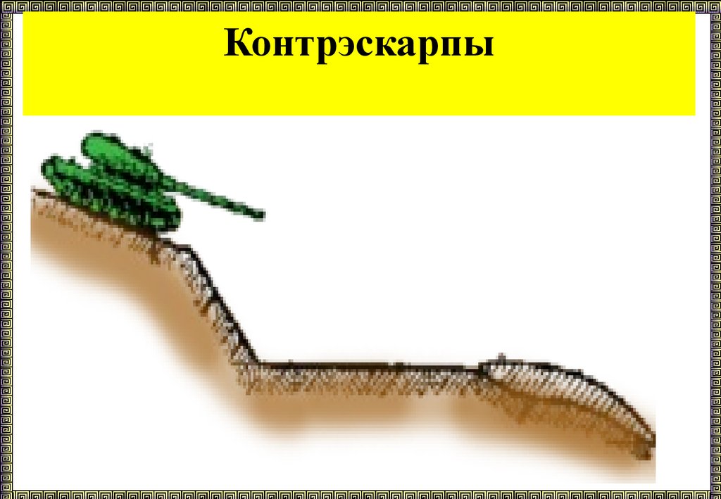 эскарпы, контрэскарпы, надолбы, противотанковые рвы,