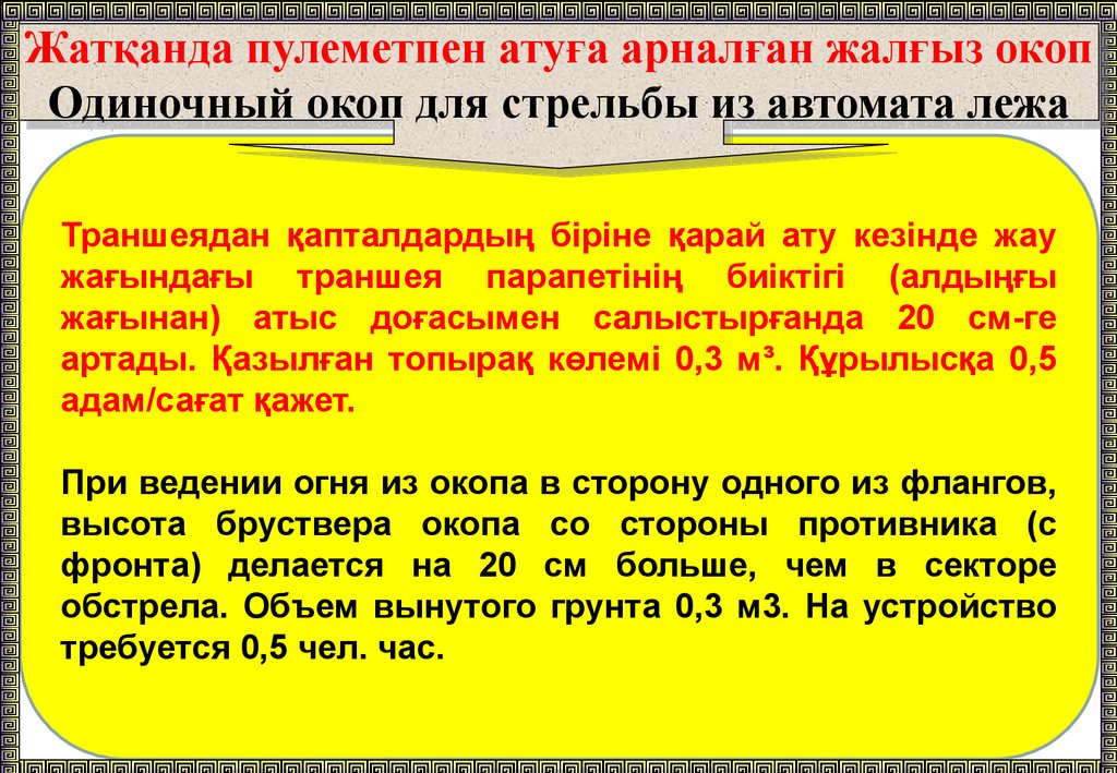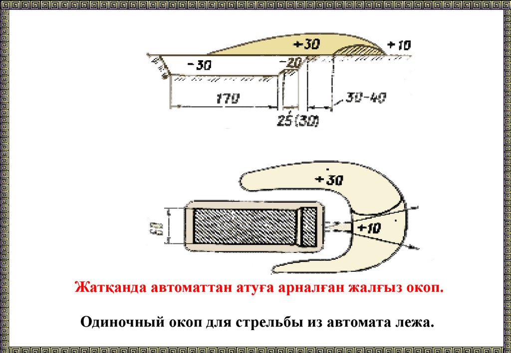 Жатқанда автоматтан атуға арналған жалғыз окоп.Одиночный окоп для стрельбы из автомата лежа.