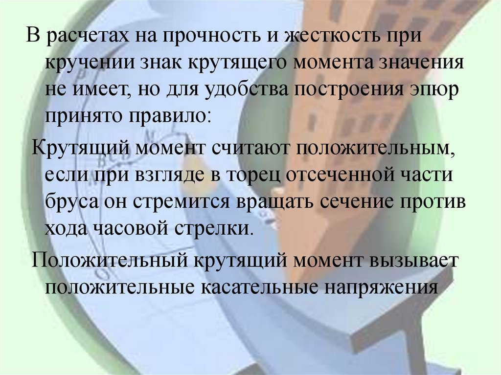 В расчетах на прочность и жесткость прикручении знак крутящего момента значения