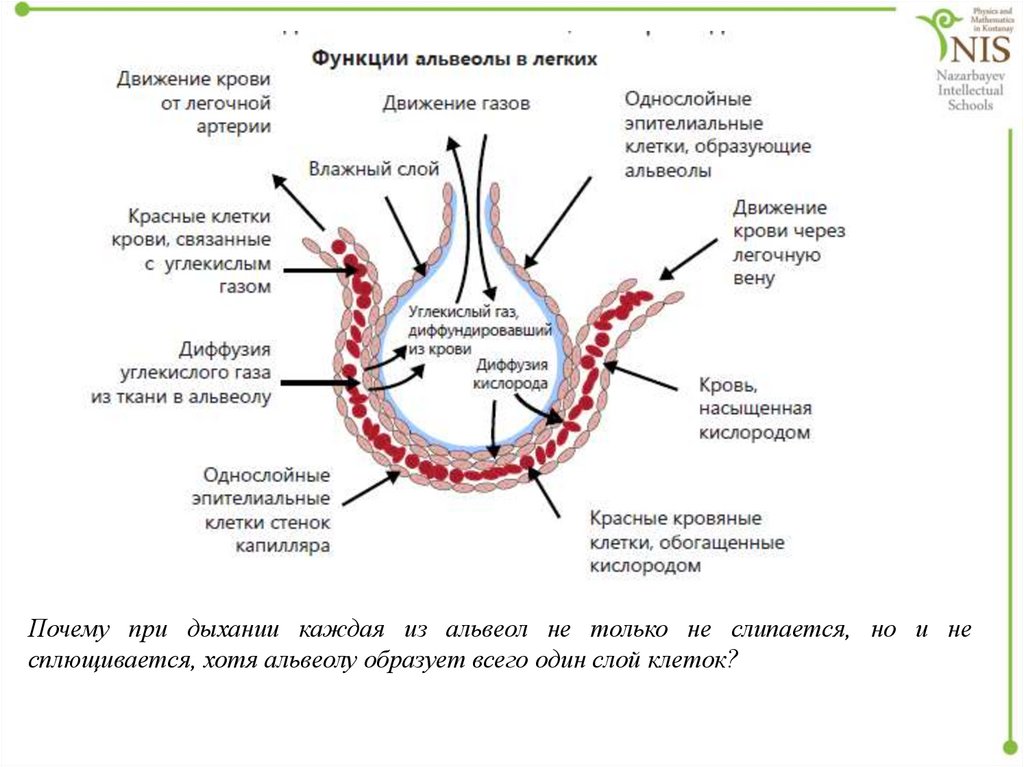 Почему при дыхании каждая из альвеол не только не слипается, но и несплющивается, хотя альвеолу образует всего один слой клеток?