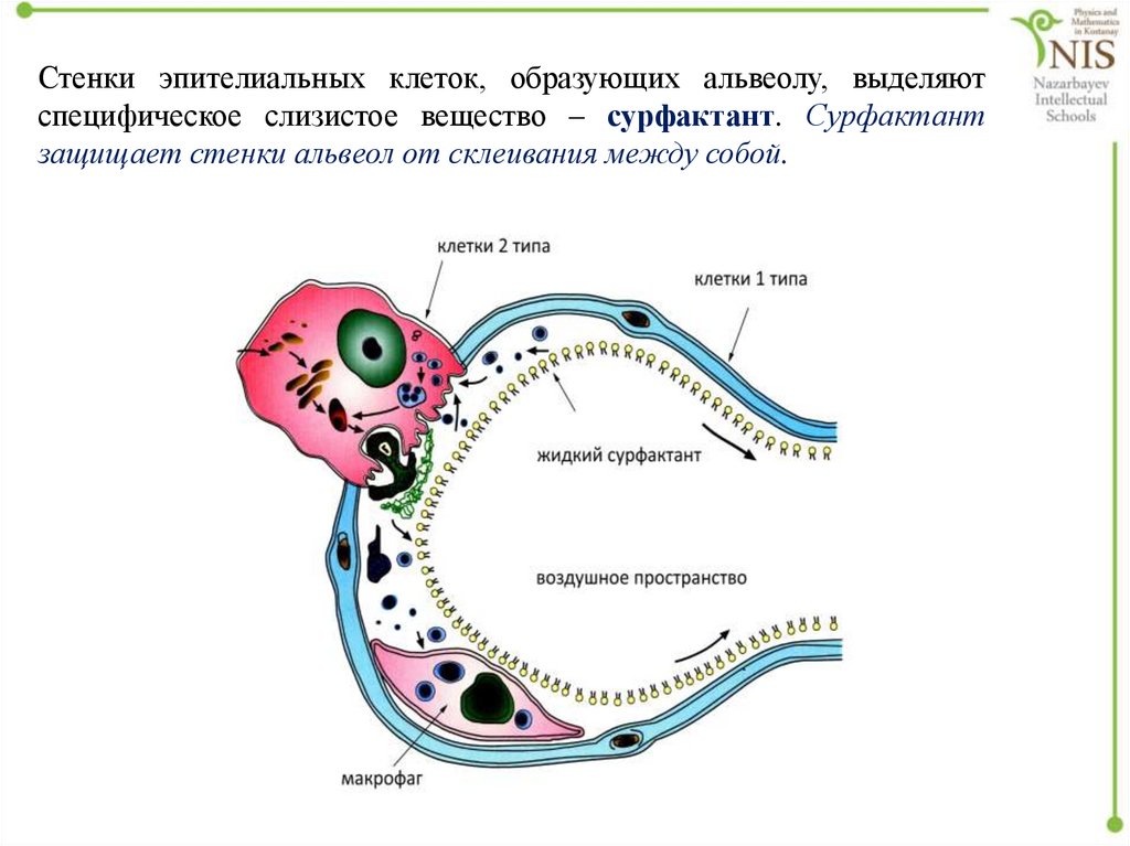 Стенки эпителиальных клеток, образующих альвеолу, выделяютспецифическое слизистое вещество – сурфактант. Сурфактант