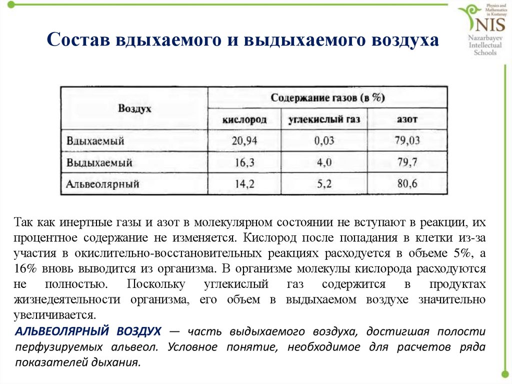 Состав вдыхаемого и выдыхаемого воздухаТак как инертные газы и азот в молекулярном состоянии не вступают в реакции, их