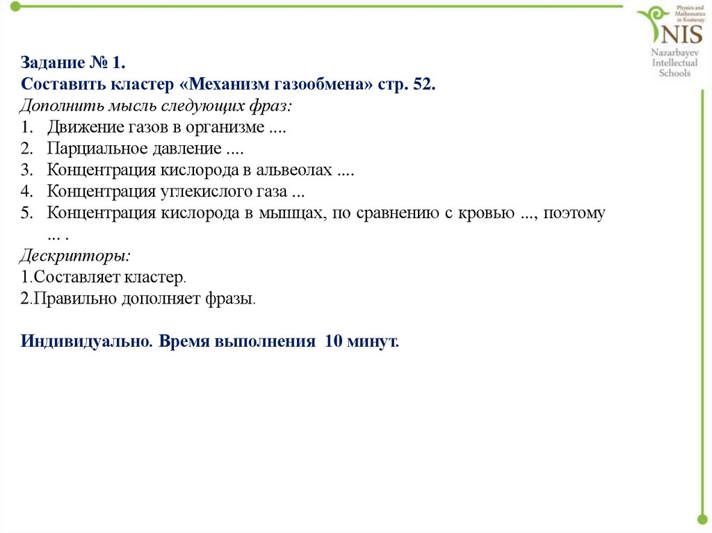 Задание № 1.Составить кластер «Механизм газообмена» стр. 52.