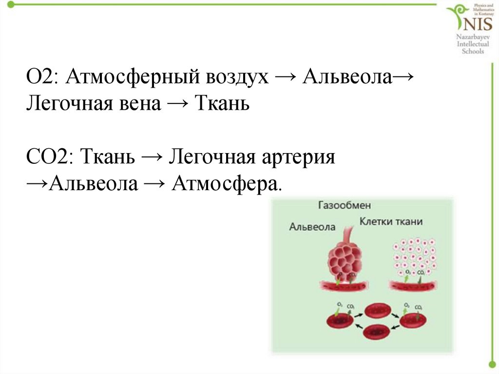 О2: Атмосферный воздух → Альвеола→Легочная вена → Ткань