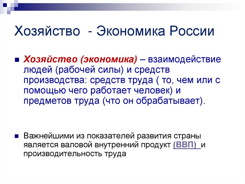 Хозяйство (экономика) – взаимодействиелюдей (рабочей силы) и средств