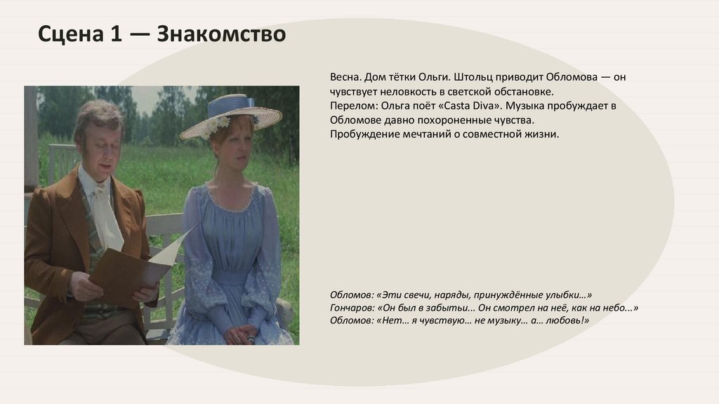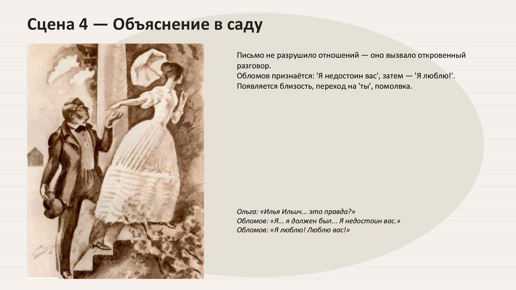 Обломов признаётся: 'Я недостоин вас', затем — 'Я люблю!'.
