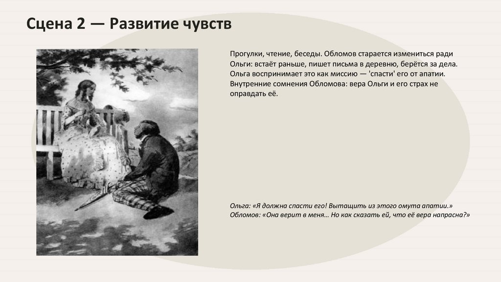 Сцена 2 — Развитие чувствПрогулки, чтение, беседы. Обломов старается измениться ради