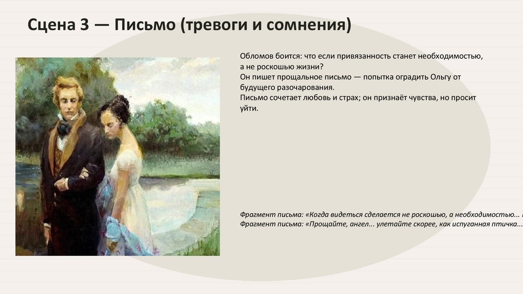 Сцена 3 — Письмо (тревоги и сомнения)Обломов боится: что если привязанность станет необходимостью,