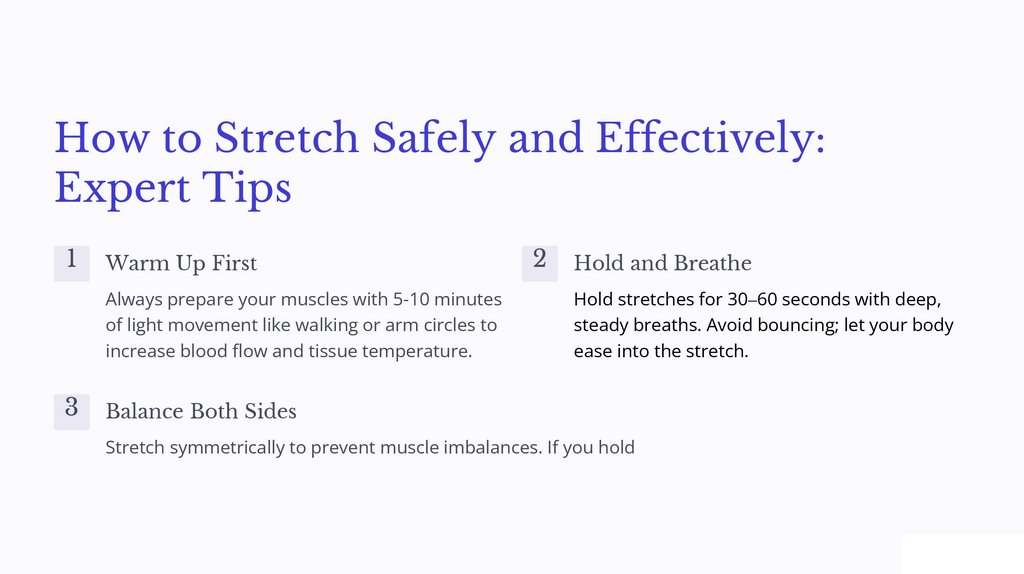 Stretch symmetrically to prevent muscle imbalances. If you hold