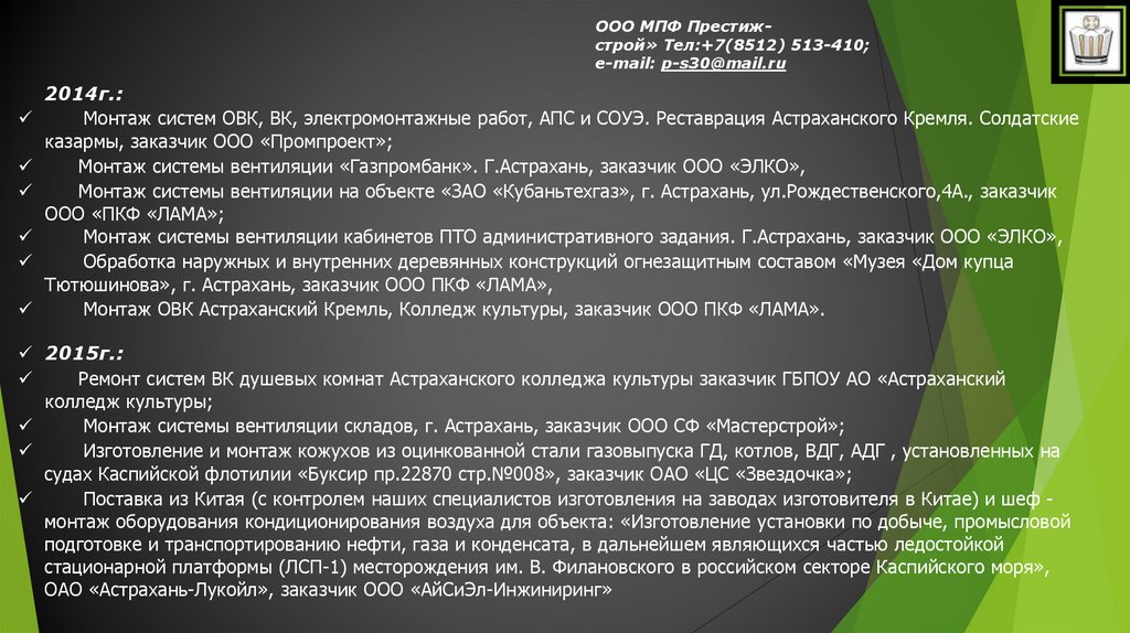 цехов судостроительного завода им.Урицкого». Г.Астрахань, заказчикООО «ЭЛКО»;