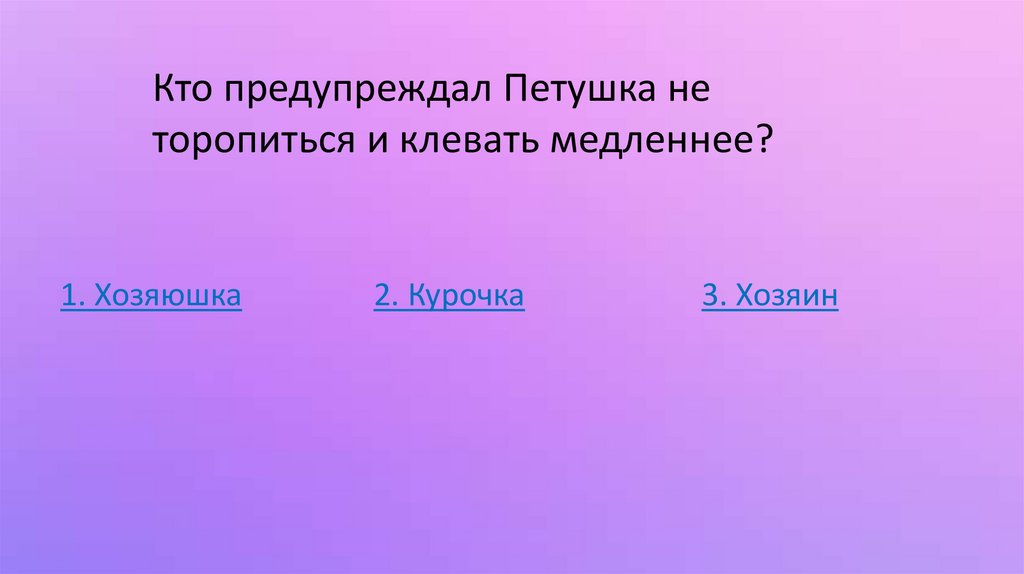 Кто предупреждал Петушка неторопиться и клевать медленнее?