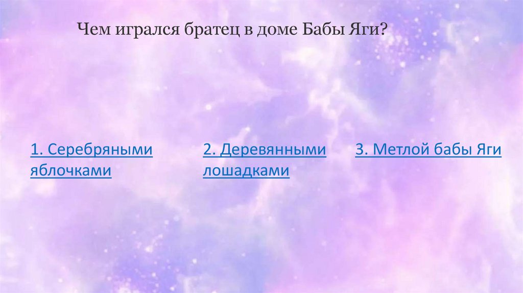 Чем игрался братец в доме Бабы Яги?1. Серебряными