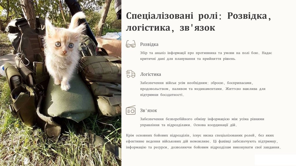 Спеціалізовані ролі: Розвідка,логістика, зв'язок